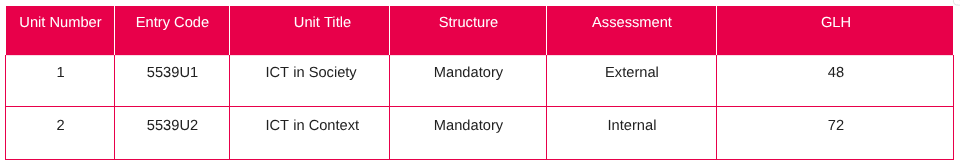 The Vocational Award in ICT has been designed to support learners in schools who want to learn about this vocational sector and the potential it can offer them for their careers or further study. It is most suitable as a foundation for further study. This further study would provide learners with the opportunity to develop a range of specialist and general skills that would support their progression to employment.